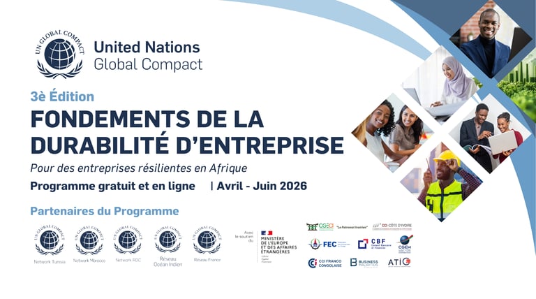 Après le succès des deux premières éditions du programme Fondements de la Durabilité d’Entreprise (FDE) qui ont réuni plus de 1300 participants, le UN Global Compact, la plus grande initiative mondiale de durabilité d’entreprise, lance une troisième édition encore plus attractive et interactive destinée aux entreprises africaines qui souhaitent renforcer leurs connaissances sur la durabilité et devenir plus résilientes.